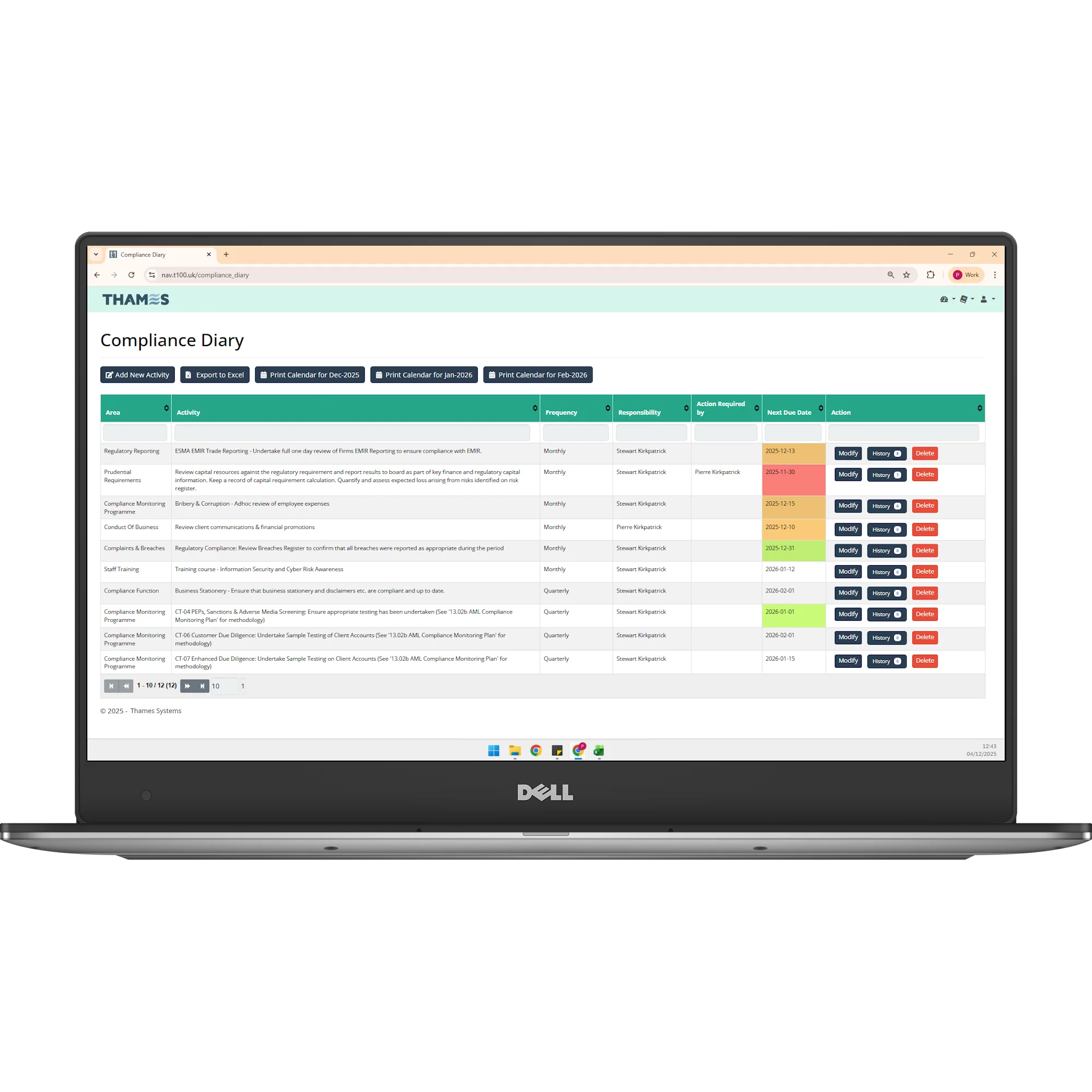 The diary retains a full, searchable history of all actions and sign-off dates. Even if staff change roles, the institutional memory remains intact, preventing compliance gaps.
